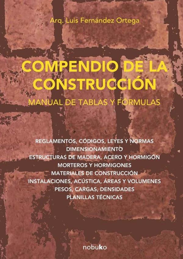 Los técnicos y profesionales del sector de la construcción necesitan tener a mano libros de consulta que les ayuden a resolver un problema o despejar una duda.COMPENDIO DE LA CONSTRUCCIÓN información práctica, clasificada por orden alfabético, de todos los temas relativos a la construcción y el diseño.Es un manual rico en tablas, fórmulas, gráficos, planos, etc., sobre temas tales como: aceros, acústica, agua, aire acondicionado, aislamiento térmico, albañilería, ascensores, azulejos, bóvedas, cal, calefacción, cámaras frigoríficas, carpintería, cemento, cocinas, columnas, combustibles, cuartos de baño, desagües, dormitorios, electricidad, escaleras, estructuras, fábricas de ladrillos, garajes, gas, hormigón, hospitales, hoteles, iluminación lámparas, maderas, mampostería, mármoles, materiales usados en la construcción, morteros, muros, paredes, pasillos, patios, pavimentos, pendientes, perfiles, pinturas, piscinas, plásticos, protección contra incendios, puertas, rampas, revoques, solados, suelos, taludes, techos, tubos y conductos, unidades de medida, vidrio, vigas, yeso, etc.